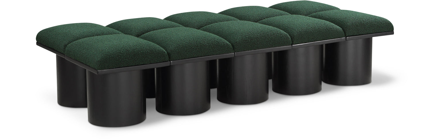 Bring valuable seating and remarkable style to your space with this Pavilion Boucle Fabric Bench, an exquisite balance of style and usability for the entryway, bedroom, and beyond. Crafted from oak veneer with a black finish, this bench has a 4-inch-thick seat cushion that's channel-tufted for a touch of luxury. The bench's columnar bases add a dash of Art Deco design, making it a captivating focal point in any room.