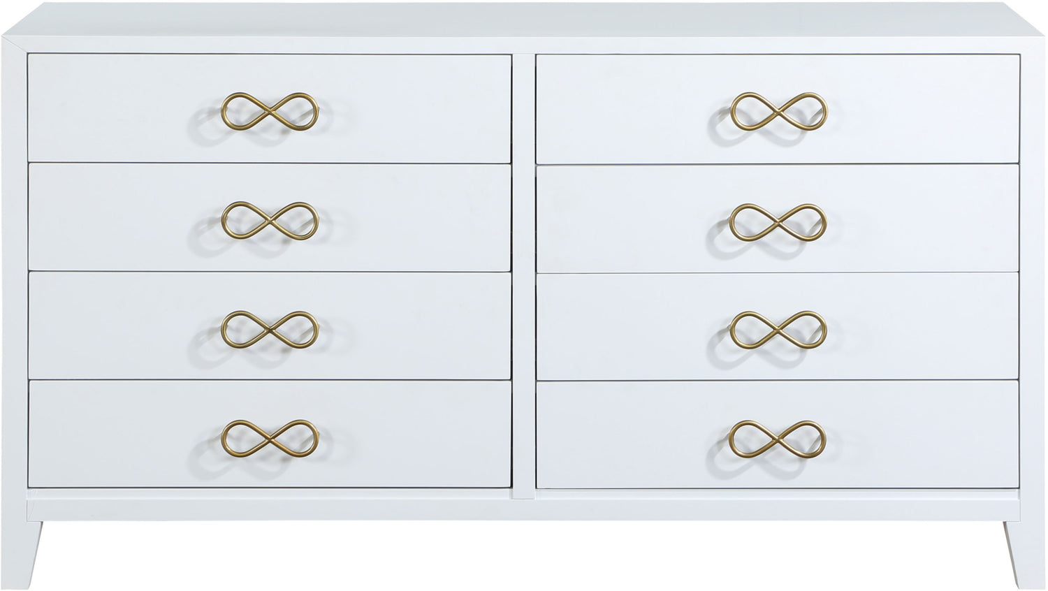 Bring unique elegance to your bedroom with this Bowtie dresser from Meridian Furniture. This dresser features eight drawers, providing you with plenty of storage space for clothes, linens, or miscellaneous objects. Its light color adds a touch of femininity to your living space, and its brushed bow tie handles complement your existing decor. Its flat top is perfect for placing a lamp, framed picture, books, bric-a-brac, and more.