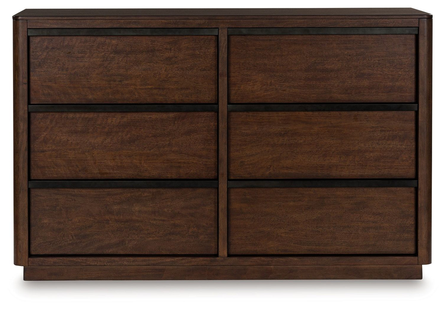 Casual contemporary styling with a decidedly modern vibe. This dresser is warm and inviting with a rich dark brown finish, adorning your restful retreat with on-trend elegance. Full-length metal pulls in a matte black finish add a subtly cool touch to spacious storage drawers. What a simply stunning way to achieve the bedroom of your dreams.