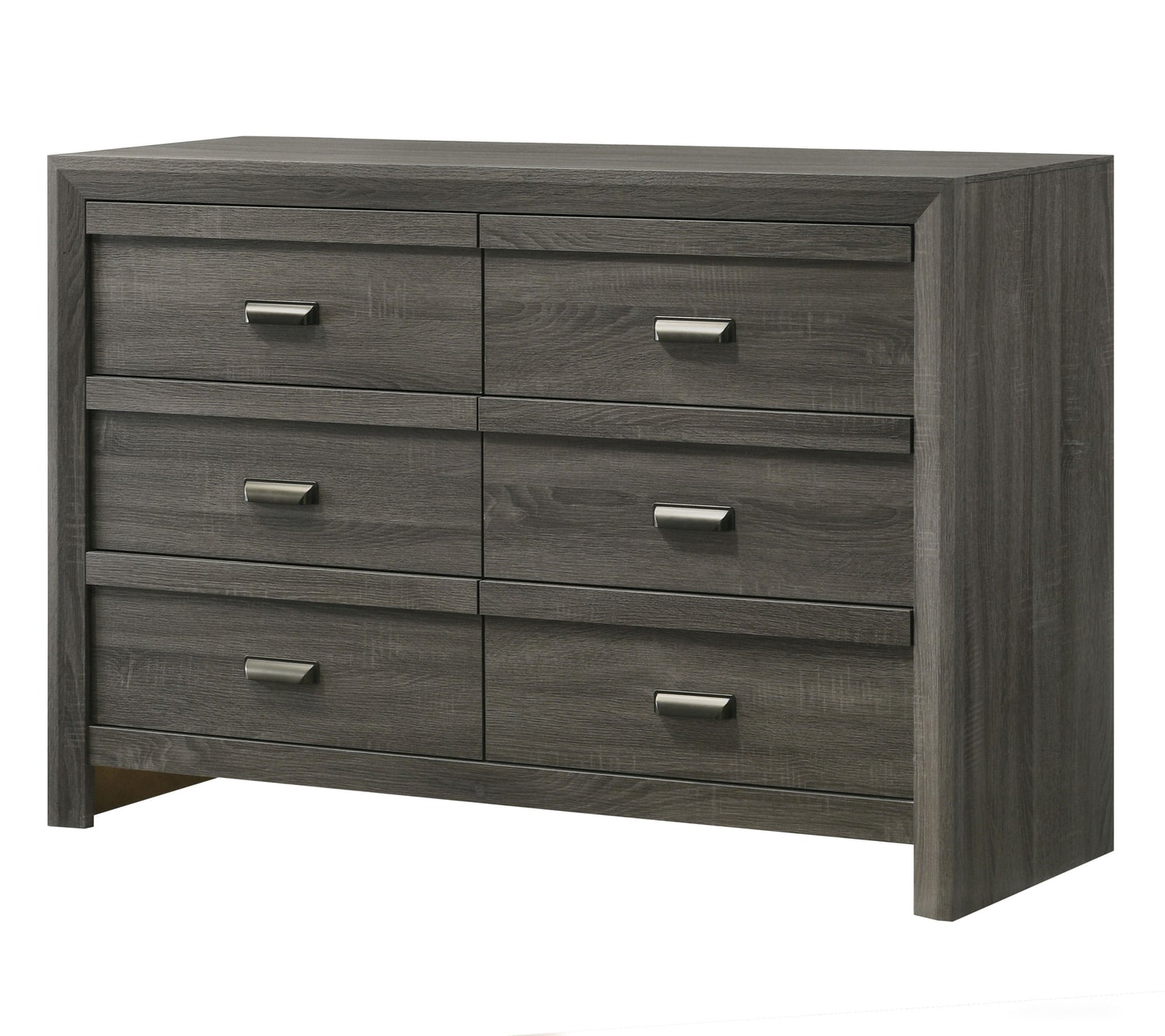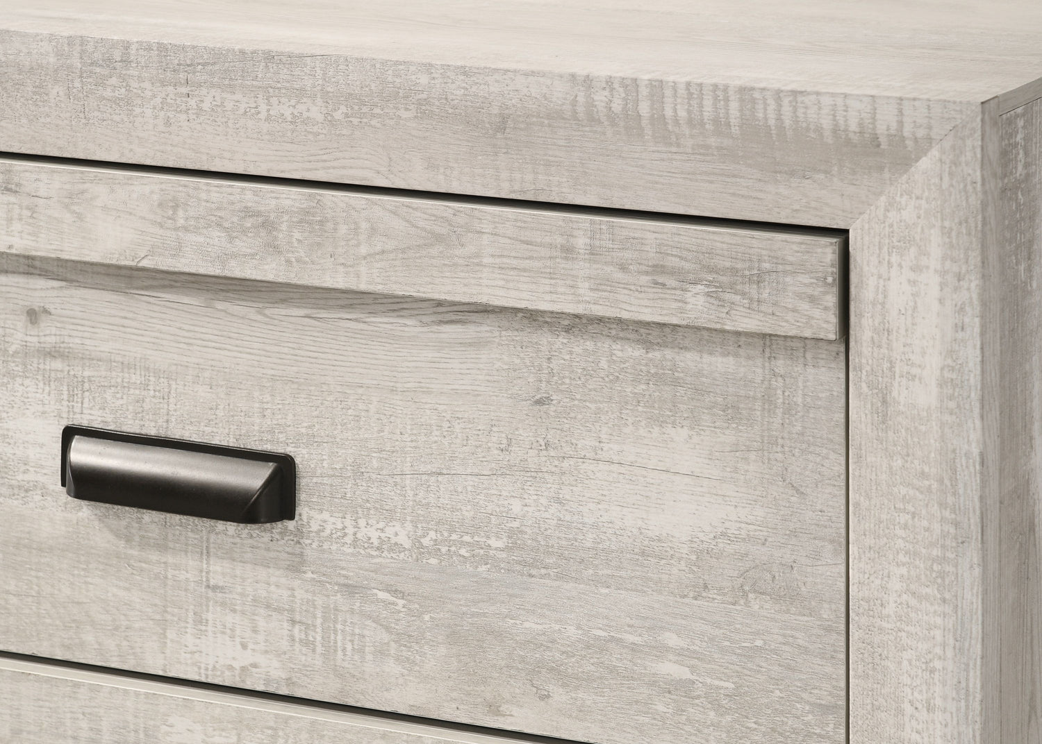 This bedroom collection encapsulates a blend of contemporary design and rustic charm. The centerpiece, a bed with a distinguished chevron patterned headboard, evokes a sense of craftsmanship and texture, infusing the space with character. Flanking the bed are matching pieces, each exhibiting clean lines and a finish that suggests a lived-in elegance. The dresser, complemented by a substantial mirror, along with the tall chest, offer ample storage solutions with understated metal handles that enhance the modern farmhouse aesthetic. A nightstand completes the set, its compact design making it a practical addition to the suite.