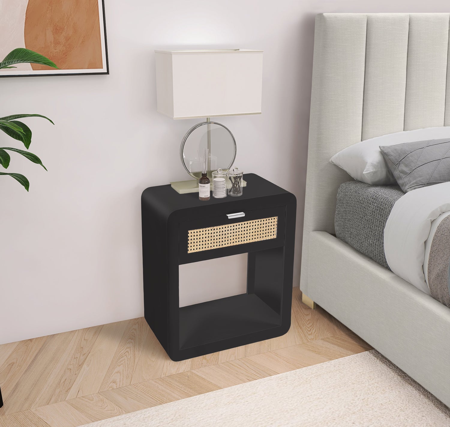 Lend your bedroom a distinctive touch with this Langham night stand from Meridian Furniture. Featuring an open, rectangular design and a natural cane drawer front, this night stand is truly unique. A sleek finish complements the existing decor in your bedroom; both brushed brass and handles are included so you can choose which one best matches your decor. This night stand s mid century design is the perfect addition to your living space.