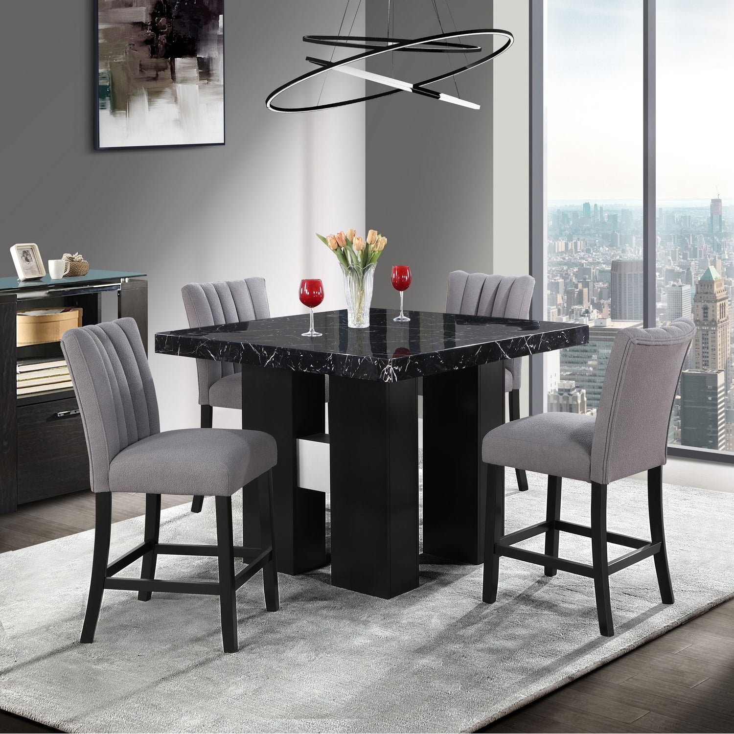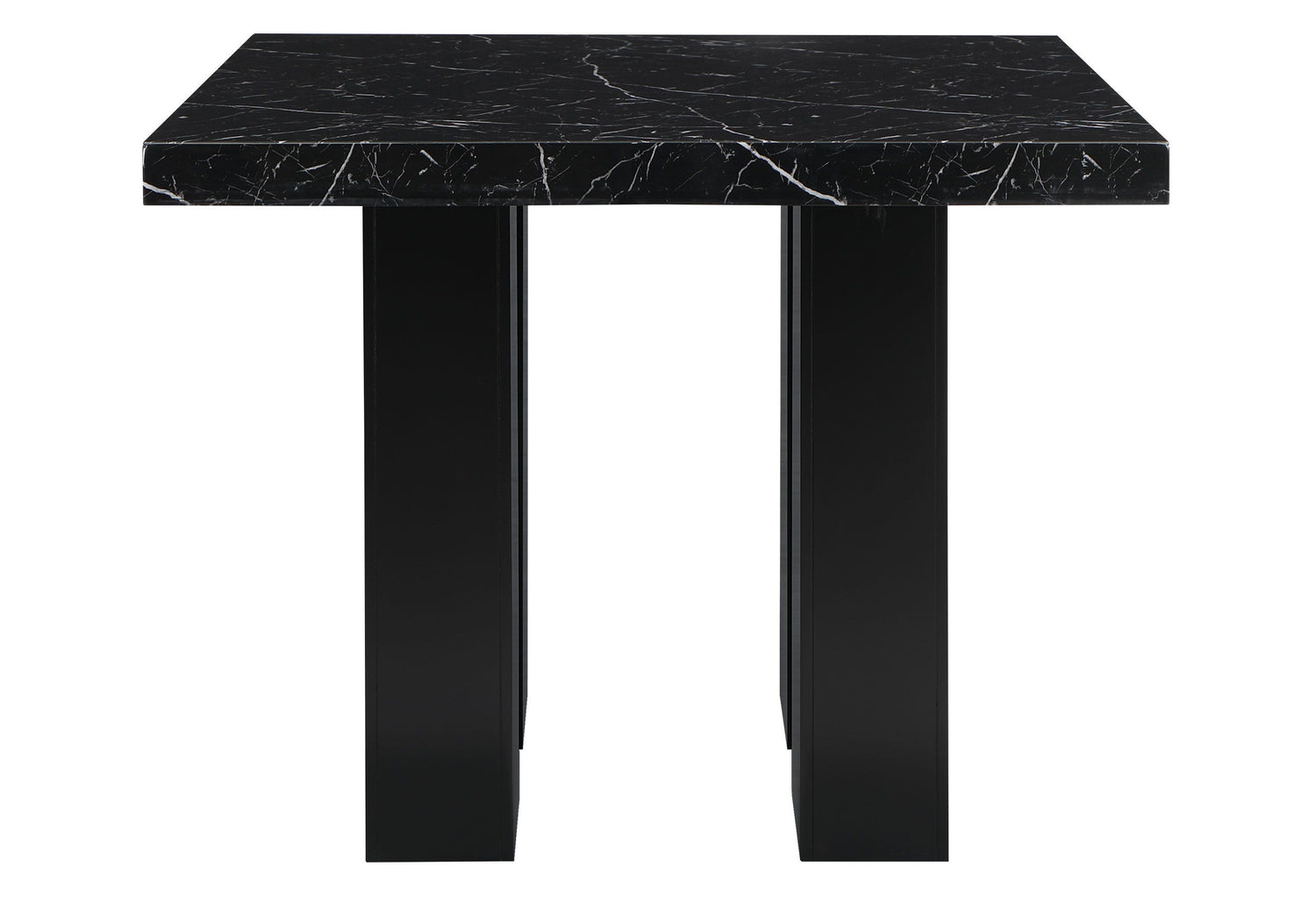 Black Faux marble counter table design with an extra thick top and a double pedestal base with silver connectors. The chairs have channel backs . The leg color matches the table base.