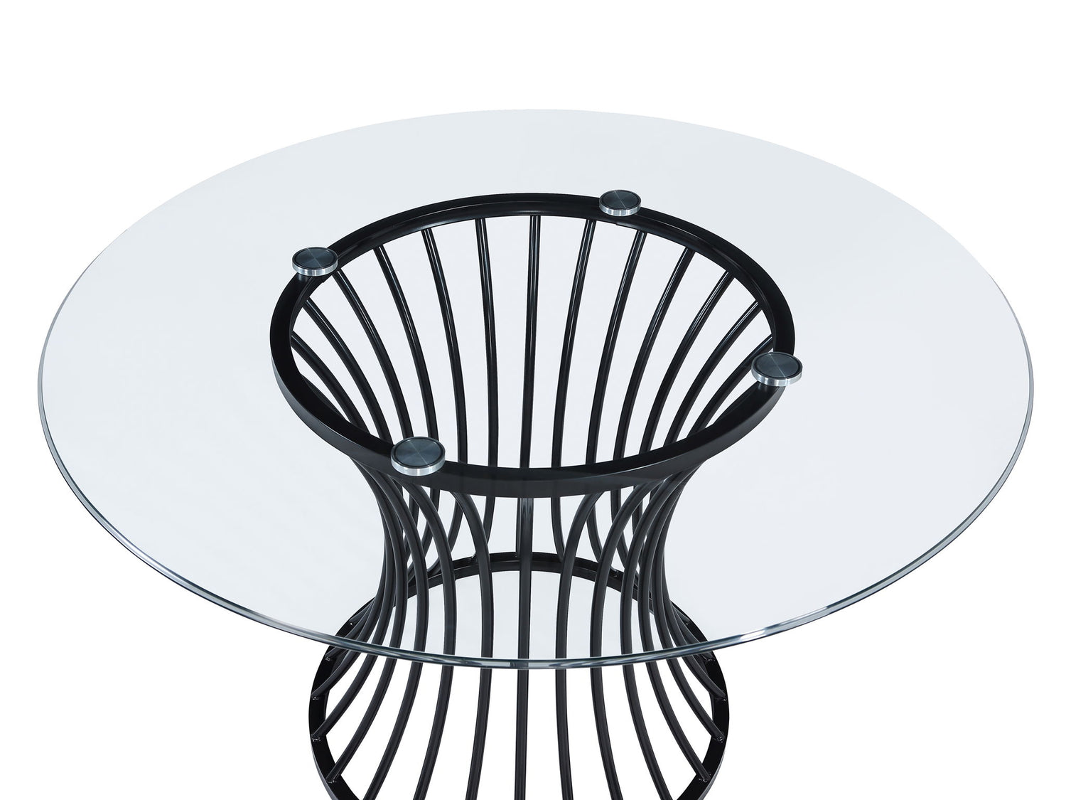 Bring contemporary elegance to your dining area with this stunning dining set, combining sleek design with timeless sophistication. The centerpiece is a striking glass-top table, featuring a sculptural black metal base that adds an artistic flair and a sense of openness to your space. The chairs, upholstered in a soft, dove-gray fabric, offer exceptional comfort and a modern aesthetic, while their sturdy black frames ensure durability. Perfect for intimate dinners or entertaining guests, this set seamlessly blends style and functionality, making it an ideal addition to any modern home.