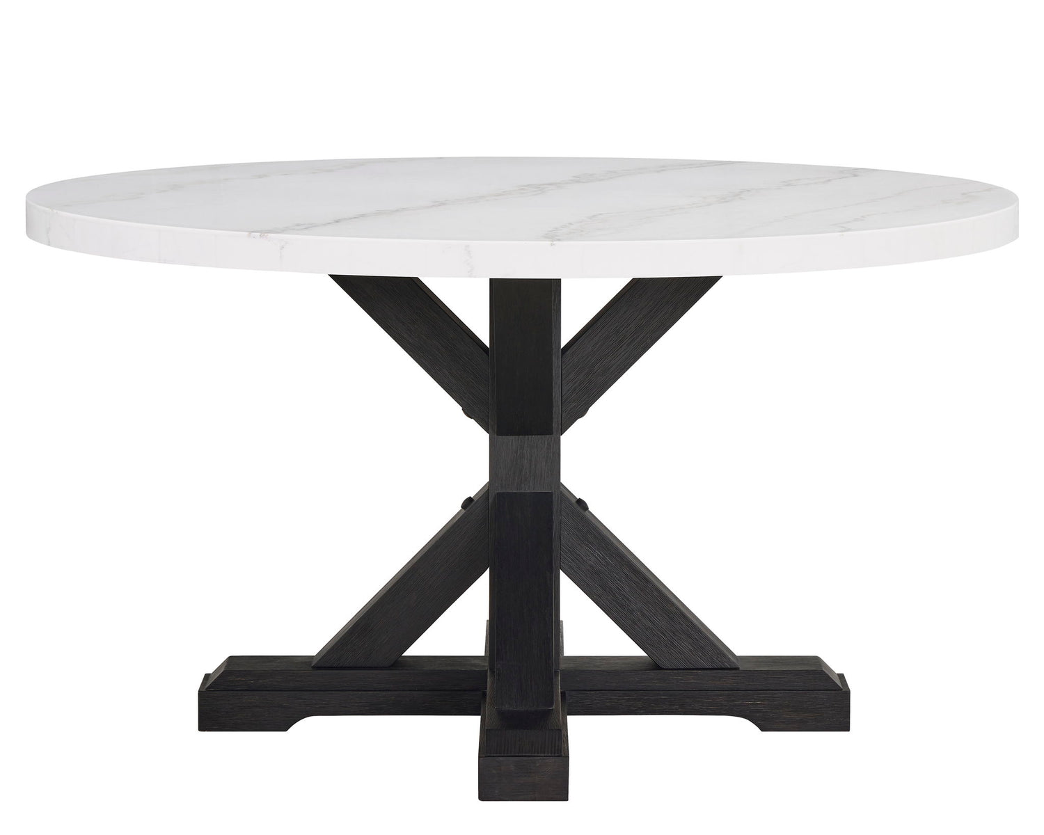 A fresh take on a traditional silhouette makes this group a great addition to your dining space. A genuine marble top is luxurious and timeless. Farmhouse style cross legs are updated in a contemporary charcoal finish. The upholstered dining chairs feature gently sloped wings and a nail head trim on the back. Button tufting accents the dining bench.