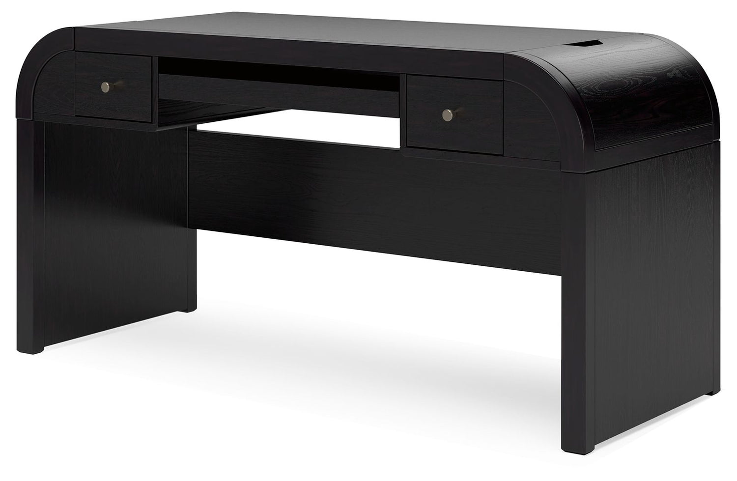 Inspired by art deco design, this softly shaped home office desk makes a lasting impression in a simply stunning way. Its magnificent curved silhouette is enhanced by a rich layered black finish on the textured wood grain surface. Complete with ample storage, a pull-out keyboard tray and USB charging, this is the all-in-one piece you’ve been looking for to elevate your contemporary workspace decor.