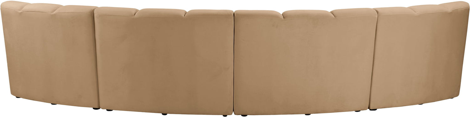 Create a seating group that works for every possible situation with this Infinity modular 4-piece sectional and other pieces in the Infinity collection. Upholstered in soft Camel velvet material that feels great against the skin and offers long-wearing beauty, this piece fits with other Infinity items for an infinite number of combinations that get your seating requirements just right but that look just as nice when used on their own.