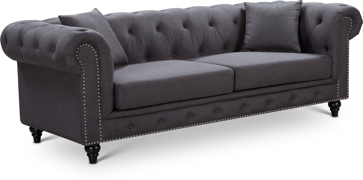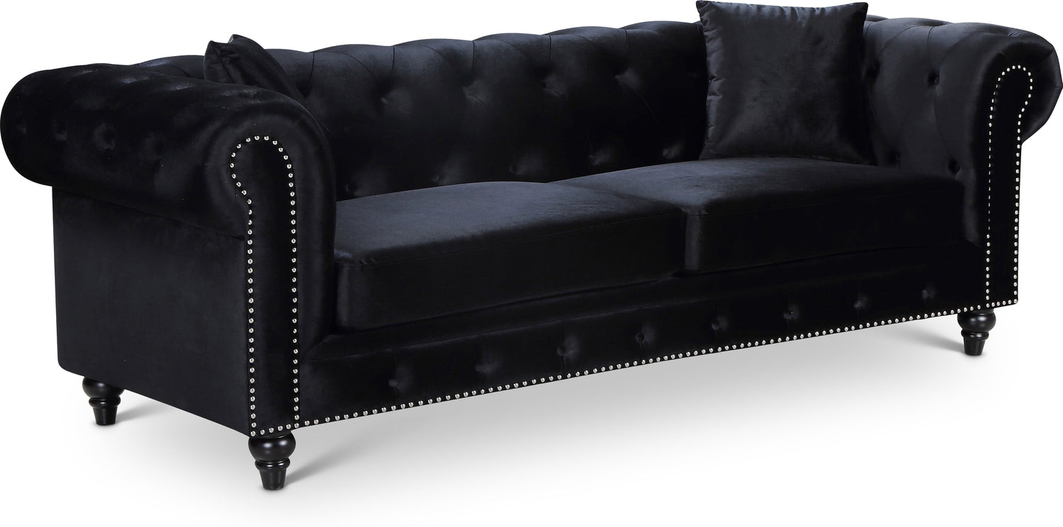 Elegant and eye-catching, the stunning Chesterfield Living Room from Meridian Furniture is the perfect addition to any space. covers the plush, comfortable seat, padded with high-density foam and modern tufted design. Strength and beauty is guaranteed with a solid wood frame and legs. Features a nail head design on the arms and includes matching throw pillows.
