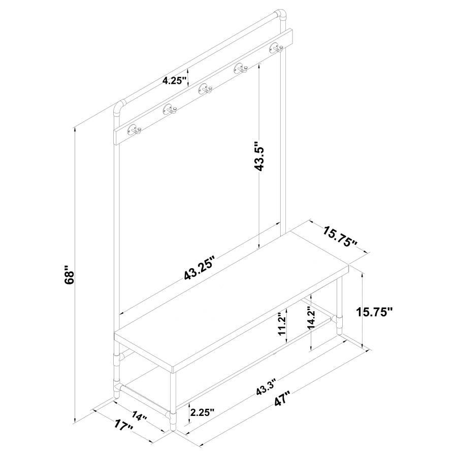 Farmhouse charm brings a fun theme to a traditional space. Perfect for an entryway, this hall tree stops clutter by organizing outerwear and shoes. An industrial-inspired pipe design delivers fresh charm. Hang coats, scarves, and purses on five included hooks, and stash shoes on a lower shelf. With a chestnut finish, this sweet hall tree offers a versatile palette.
