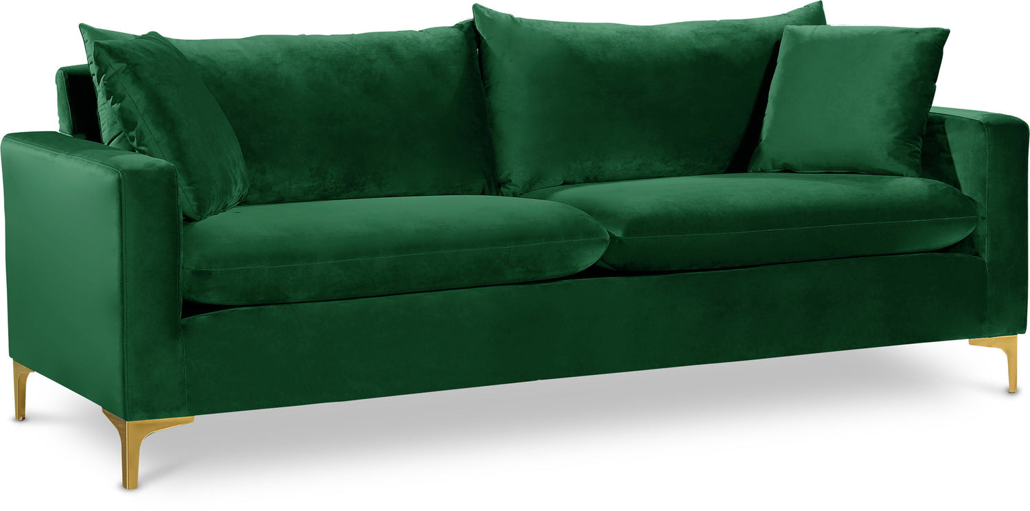 Curl up with a good book from the welcoming confines of this Naomi Sofa. The color of this sofa adds a bold touch to your decor and shakes up otherwise neutral color schemes. Plush velvet material feels cozy and comfortable against your skin, while deep seat cushions provide lots of room for you to stretch your legs. This sofa comes with both and legs, so you can customize its look to meet your decor plans. Pillows are included for added homey warmth and comfort.