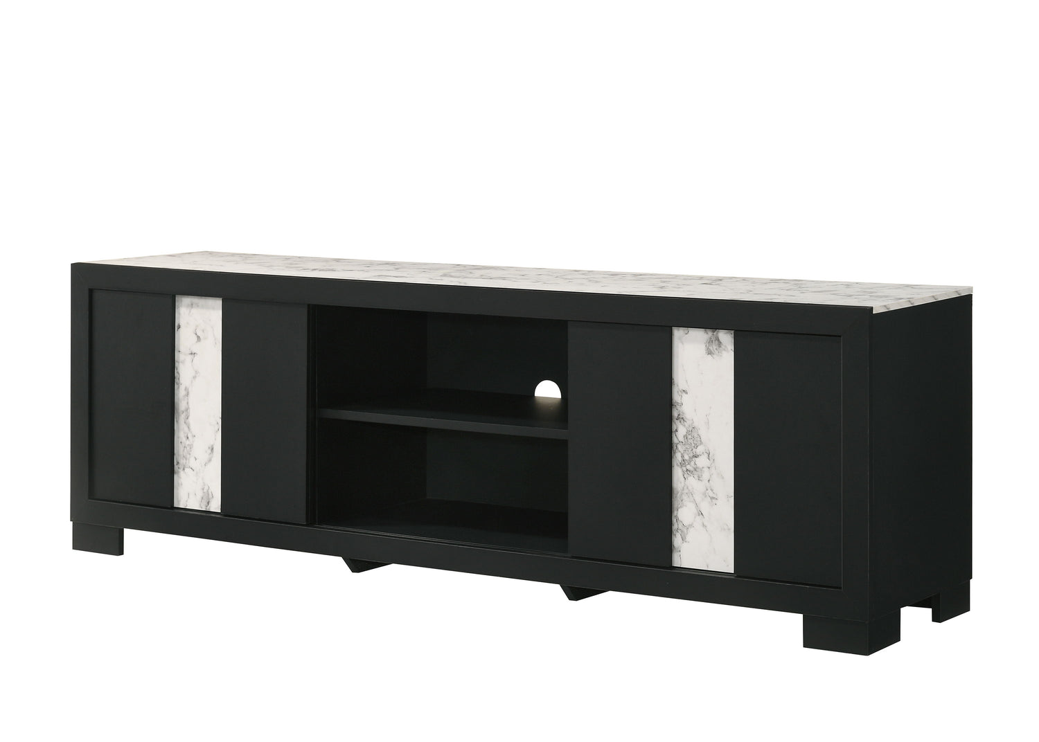 This sleek and modern entertainment unit is the epitome of contemporary elegance and functional design. Boasting a bold finish with striking marble-like accents, this piece serves as a captivating centerpiece for any living space. Its generous surface perfectly accommodates large screen displays, while the ample storage space including open shelving and discreet cabinets provides a neat solution for all your multimedia devices.