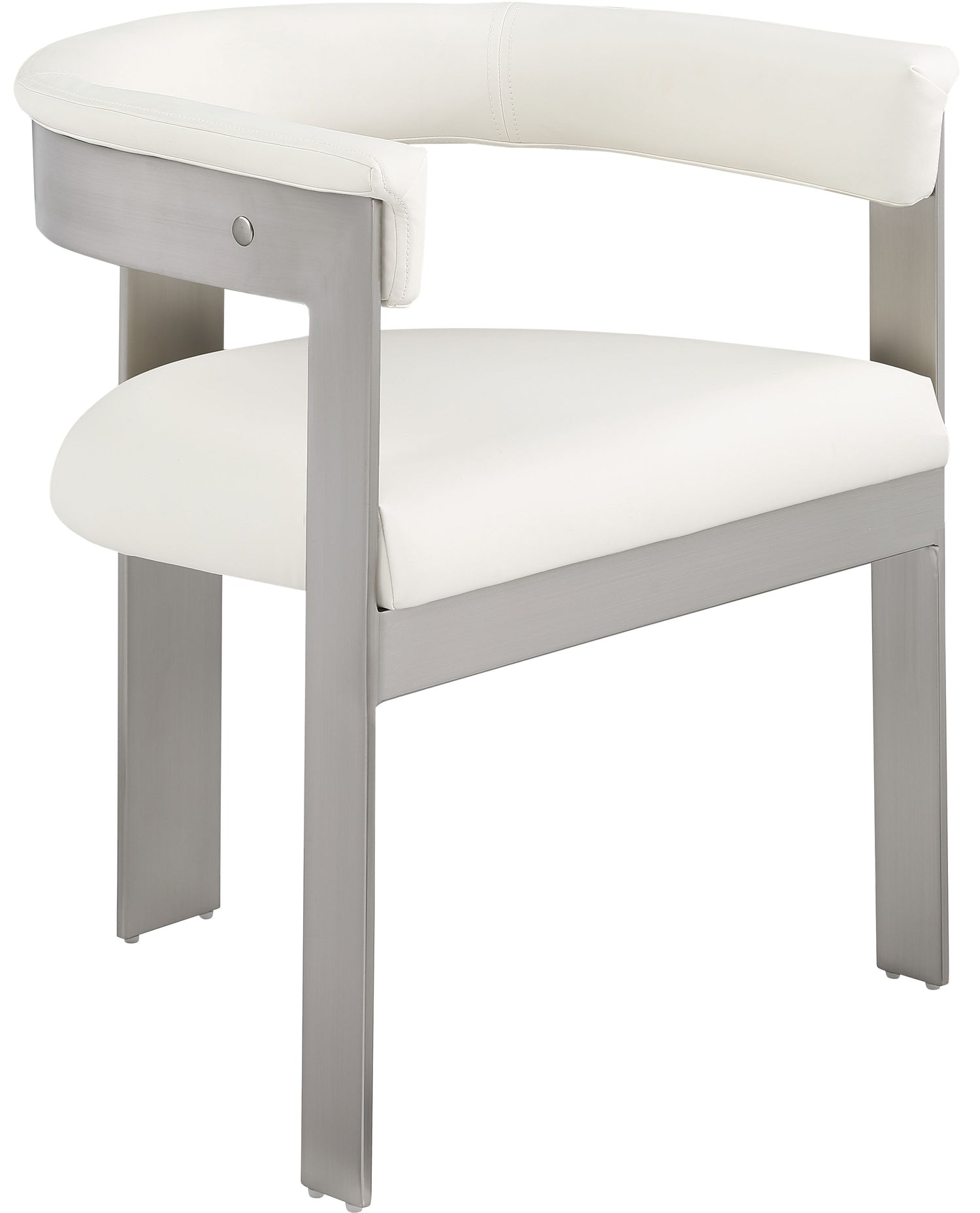 Enjoy an elevated dining experience when you bring home these Romeo vegan leather dining chairs, sold as a set of two. Featuring seats and backs upholstered in soft vegan leather, these chairs offer both style and comfort. The brushed chrome metal frames add a contemporary touch, making this pair of dining chairs a chic addition to your dining area. The curved backs provide not only a sleek look but also optimal support for the body, ensuring diners are relaxed from appetizers through dessert.